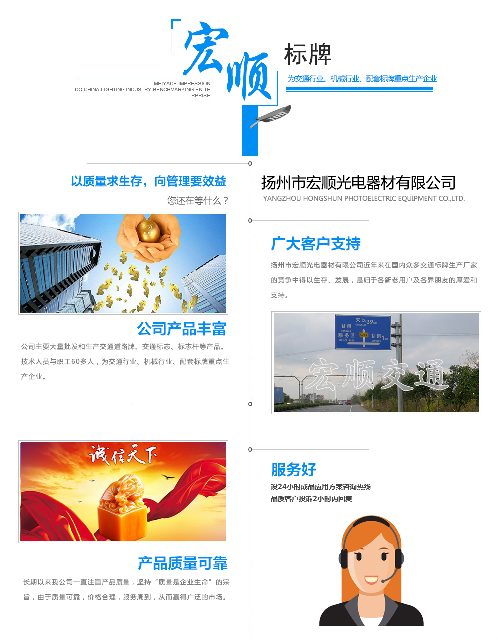 揚州市宏順光電器材有限公司近年來在國內(nèi)眾多交通標(biāo)牌生產(chǎn)廠家的競爭中得以生存、發(fā)展,是歸于各新老用戶及各界朋友的厚愛和支持。我們?nèi)w員工向你們致以誠摯的感謝。 為使我們共同步入新世紀(jì),提高我們的產(chǎn)品質(zhì)量與服務(wù)希望對我們提出寶貴的意見,使我們不斷改進、創(chuàng)新。 我們將和過去一樣,視今天的質(zhì)量為明天的市場。為您奉獻滿意的各種精品,為美化我們的交通事業(yè)做出貢獻。 公司主要大量批發(fā)和生產(chǎn)道路交通標(biāo)志牌、道路指示牌、交通標(biāo)志牌、指路牌、反光標(biāo)志牌等產(chǎn)品。技術(shù)人員與職工60多人,為交通行業(yè)、機械行業(yè)、配套標(biāo)牌重點生產(chǎn)企業(yè)。 長期以來我公司一直注重產(chǎn)品質(zhì)量,堅持“質(zhì)量是企業(yè)生命”的宗旨,由于質(zhì)量可靠,價格合理,服務(wù)周到,從而贏得廣泛的市場,近年來隨著交通事業(yè)的開發(fā)和研究,傾聽用戶的意見,使得我們在市場競爭中不斷發(fā)展壯大。 我們本著“質(zhì)量可靠、信譽優(yōu)先、用戶至上”的宗旨,“以質(zhì)量求生存,向管理要效益”的信條,竭誠為... ...【查看更多】